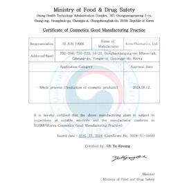 Сертификат выданный Министерством безопасности пищевых продуктов и лекарств Республики Корея.
